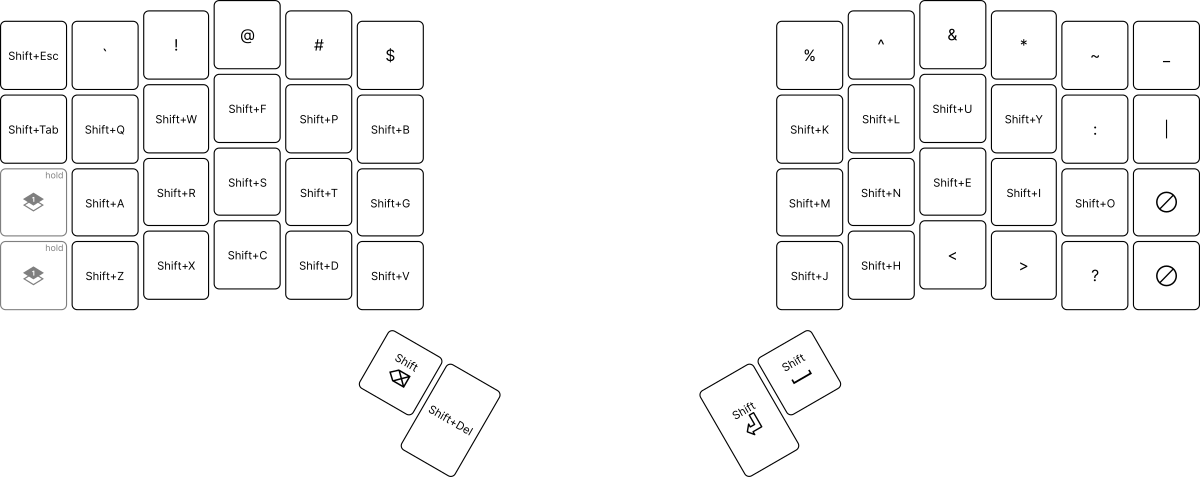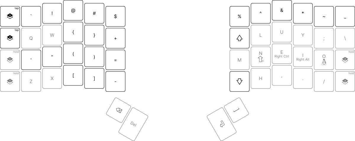 I tried option 2 for a little bit but couldn’t get it to work. Part of it was because the timing was awkward. Everytime I wanted to navigate around my code I would have to press and hold another key before hitting the arrow keys. The whole experience felt very awkward, especially given how often I switch between navigation and typing. Another point of contention was the limited keyspace on the Voyager. There wasn’t a really good place to map it on. I already liked the way Space, Enter, Delete, and Backspace felt on the thumbkeys so I didn’t want to put it there. Sure, I could overload one of the keys and make it switch on hold, but that just made the timing worse.